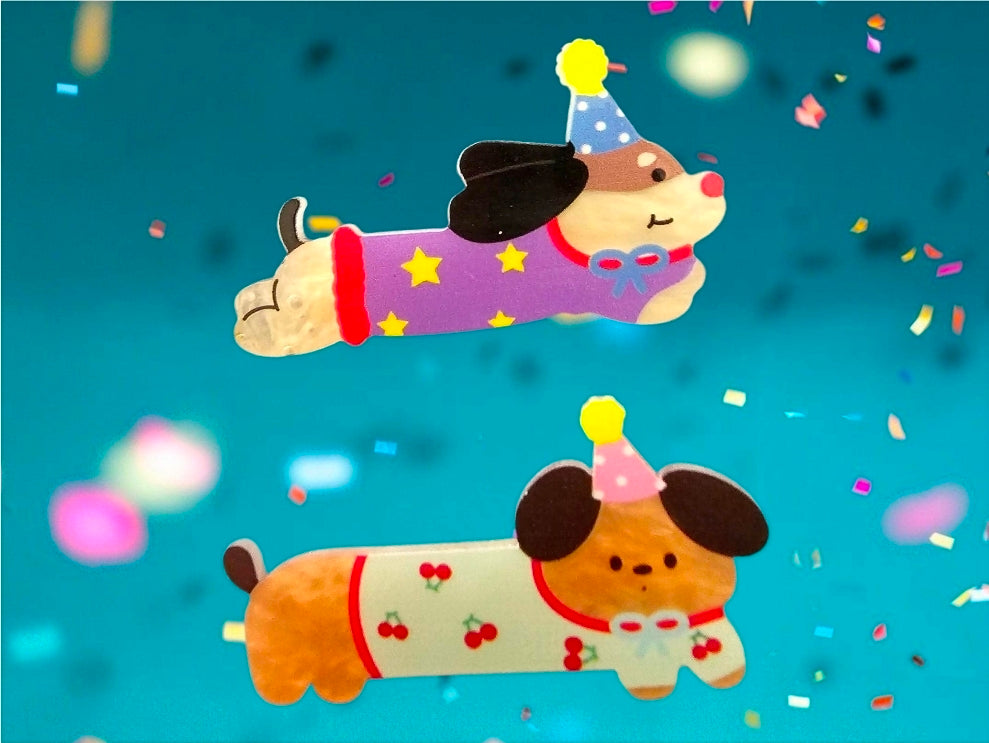 This Birthday Dog Hair Clip Set includes two adorable alligator clips — one in a cherry print and one in a star print, both featuring a playful puppy in a party hat! Perfect for kids, pet lovers, or anyone who can't resist a little dog-themed charm.