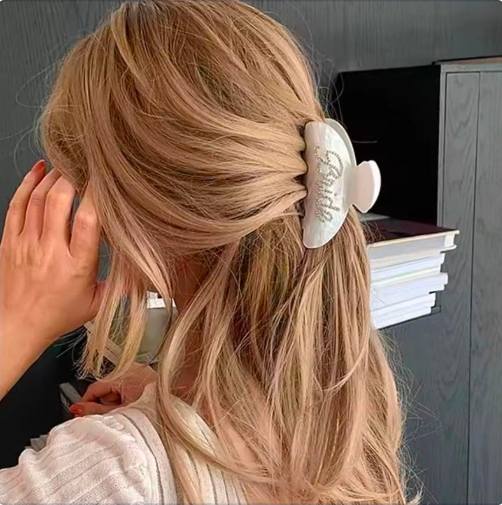 This dreamy pearl-white acrylic claw clip is the perfect finishing touch for any bride-to-be. Featuring sparkling rhinestone "Bride" script across the front, this elegant yet playful piece is made to be worn and remembered. Whether it's for the bachelorette party, bridal shower, rehearsal dinner, or the big day itself — this clip adds a touch of magic to every moment.