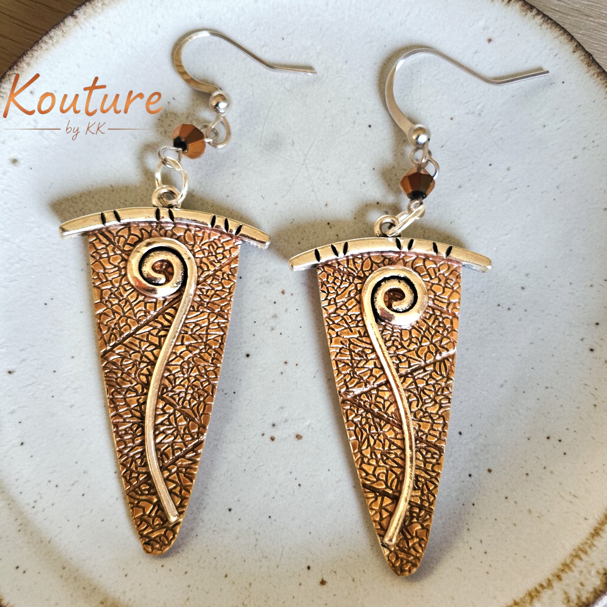 Make a bold statement with these stunning Bronze Copper Spiral Triangle Earrings. Each earring features an intricately textured triangular design in warm bronze and copper tones, accented with an elegant raised spiral that catches the light beautifully.