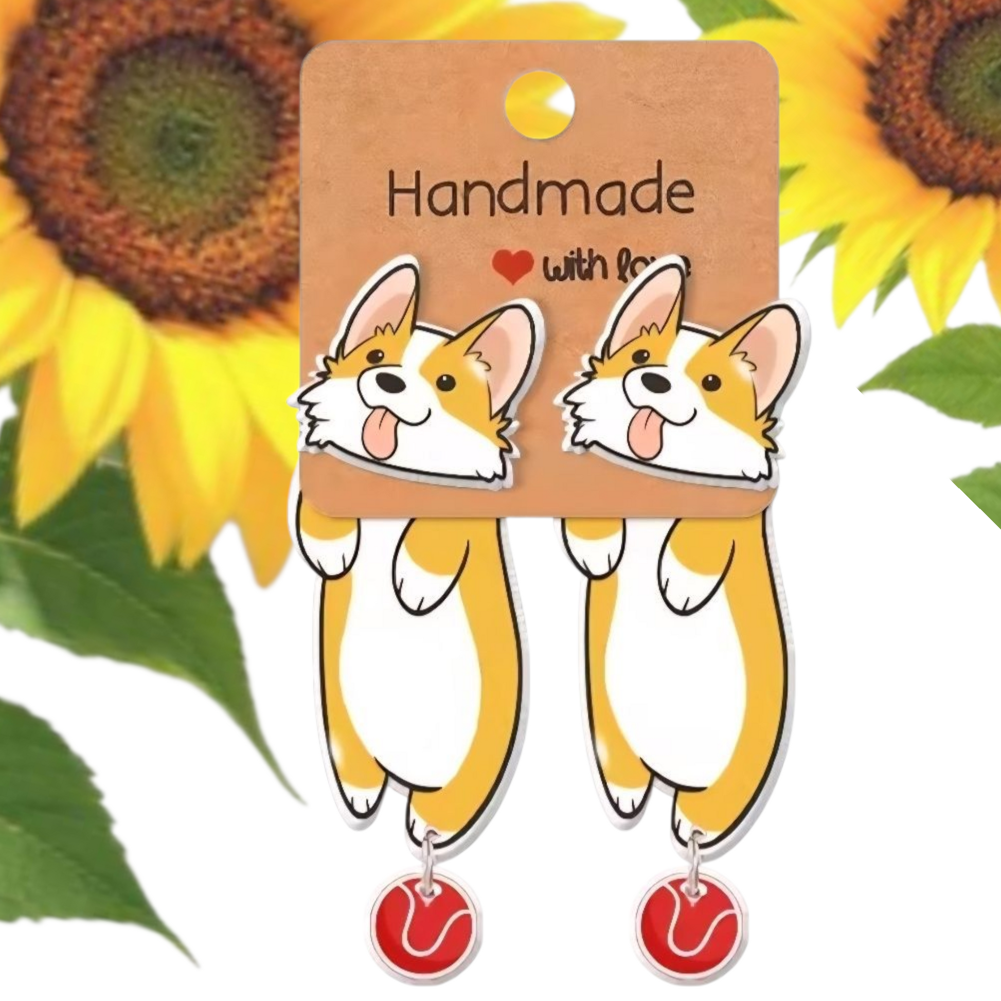 Corgi Dog Earrings – Dangling Tail with Red Ball