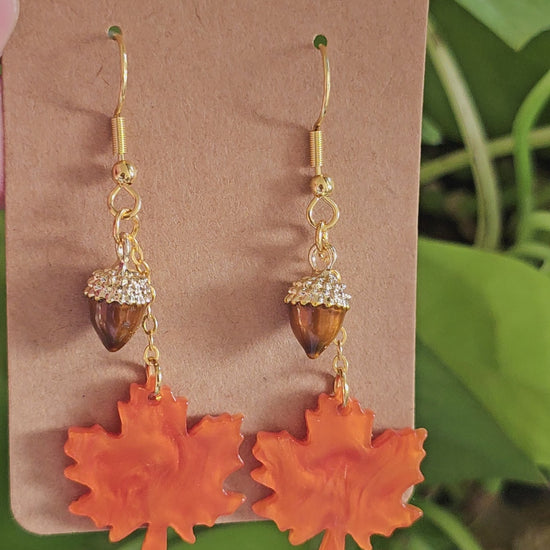 Fall Harvest Dangling Leaf Earrings with Pine Cone – Burnt Orange on Gold Chain