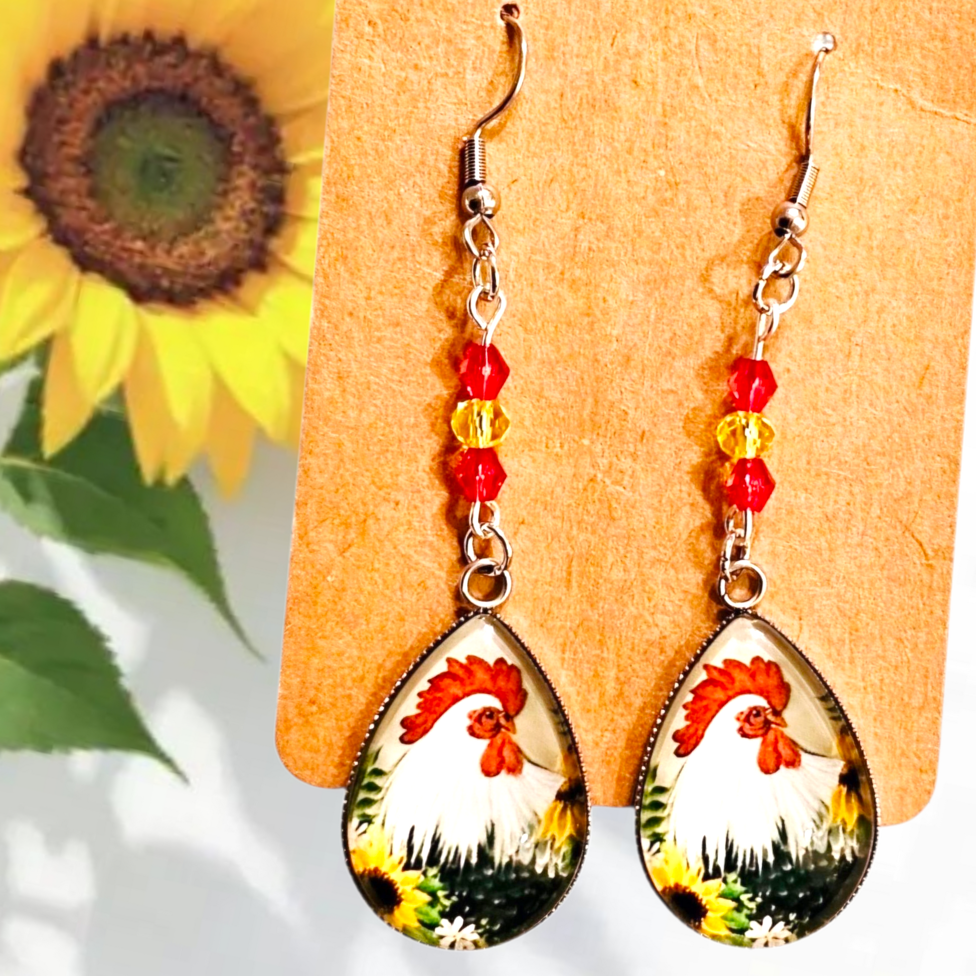 • Handmade rooster earrings with sunflower detail