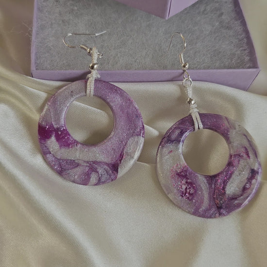 .Each pair is born from raw polymer clay that I sculpt into delicate hoops, layering purples, pinks, and shimmering whites by hand to capture the mesmerizing beauty of a distant galaxy. I embed shimmering silver and pink foils into the clay, creating depth and sparkle that catches the light from every angle. Then comes the most intimate detail: I hand-wrap soft white silk cord around each connection point, tying and securing every knot individually.