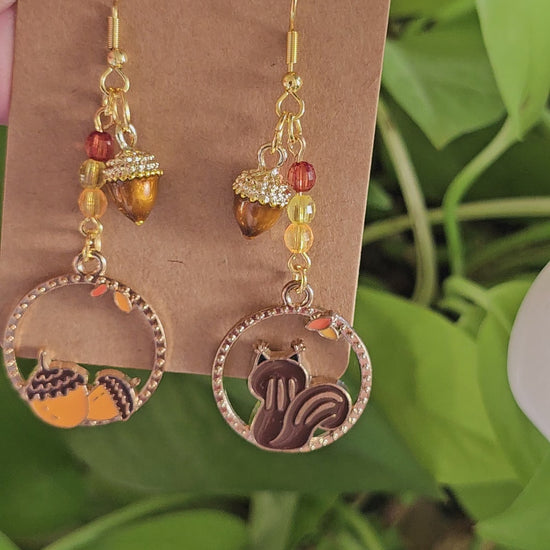 🌰 Each earring set features a cute squirrel and acorn charm set in a gold-toned round frame, accented with crystal-like amber and golden beads that catch the light beautifully. The delicate acorn charm adds the perfect finishing detail — it's like a tiny piece of fall magic you can wear.