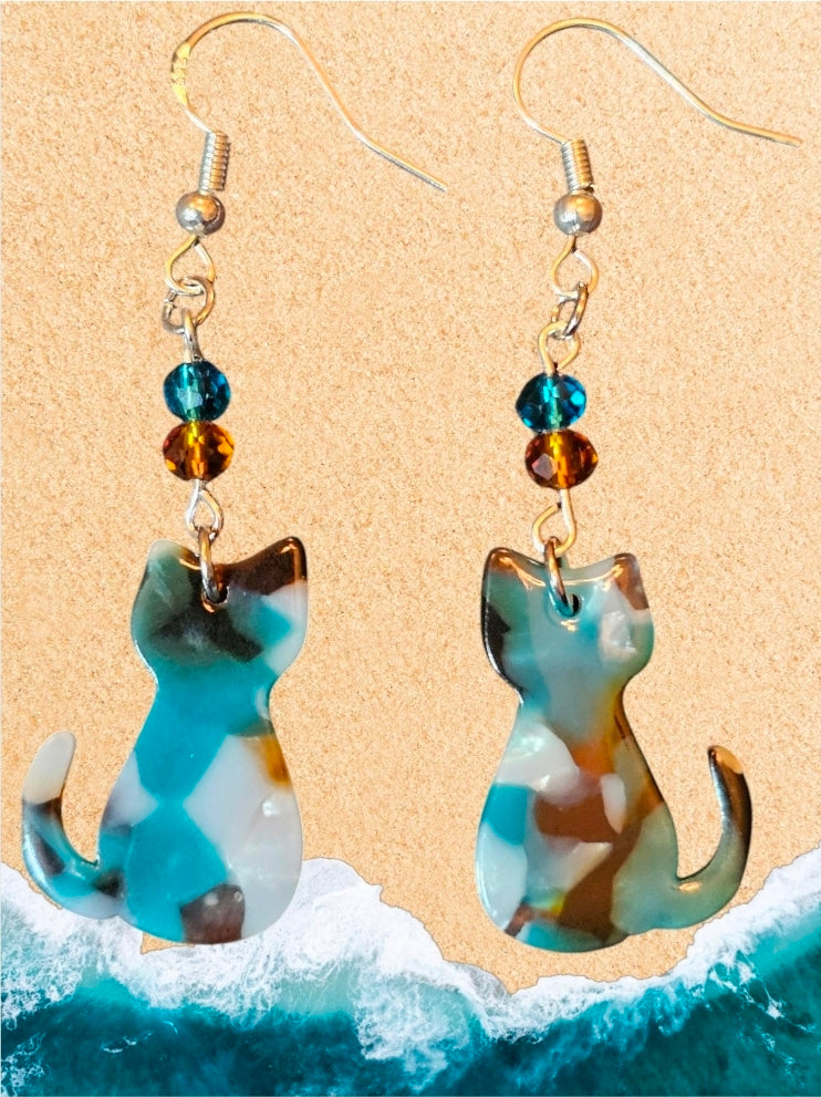 These acrylic cat earrings look like polished stone with a beautiful glossy shine. Waves of turquoise blue blend with warm brown tones, creating a unique marbled effect that catches the light beautifully. Each pair is accented with matching crystal beads that add just the right amount of sparkle.